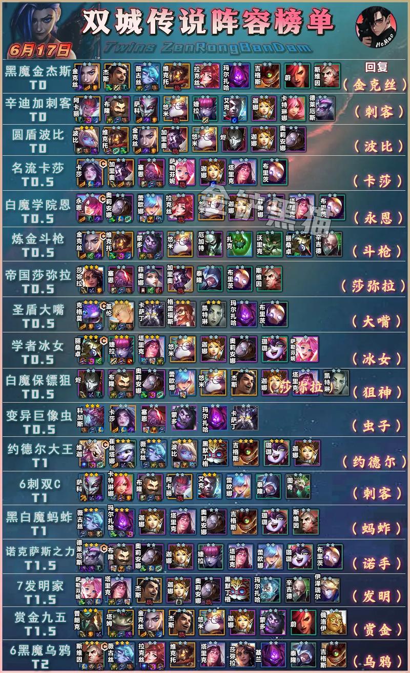 〖Three〗、约德尔人阵容:以低费卡为基础,前期容易成型。核心英雄为小炮和阿狸,装备推荐无尽之刃、蓝霸符等。海克斯推荐“如此矮小”、“黄金门票”等。执法官狙神阵容:拥有强大的控制和输出能力。核心英雄为烬和泽丽,装备推荐无尽之刃、轻语等。海克斯推荐“执法官之心”、“狙神之巢”等。