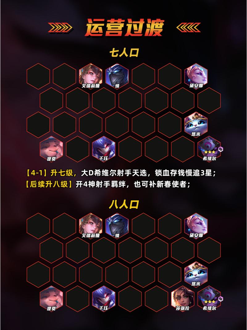 阵容分析部分,建议首先组建6/8黑魔法师,包括乌鸦、玛尔扎哈、维克托、薇古丝、狐狸、炸弹人、火男,以及可选的2学3辛迪加(希尔科、婕拉、莫甘娜)和3白魔(赛娜、莫甘娜、露露)。