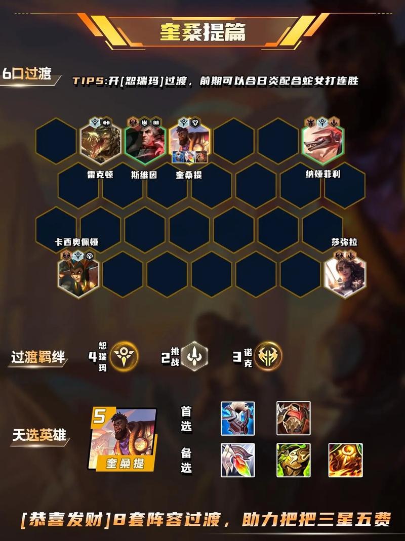 阵容分析:前期尽量用强势棋子与羁绊打工,保证打工棋子2星,确保血量的健康,7与8阶段开始转型,找核心卡。『2』阵容主要由以下羁绊组成。『3』海克斯:优先海克斯转职和粉碎器,没有的话续航类、经济类也可以考虑。