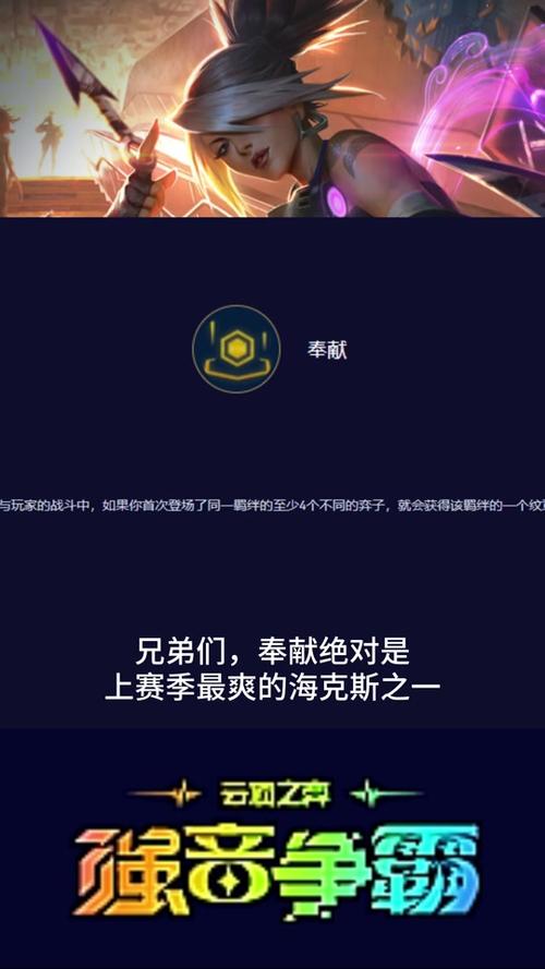 〖Five〗、在金铲铲之战S9版本中,奉献海克斯是一种二级强化符文。它的效果是在战斗中,如果你首次召唤了同一羁绊的至少五个不同的弃子,就能获得该羁绊的一个纹章。这种机制鼓励玩家在游戏中灵活使用不同类型的弃子,以触发奉献海克斯并获得相应的奖励。