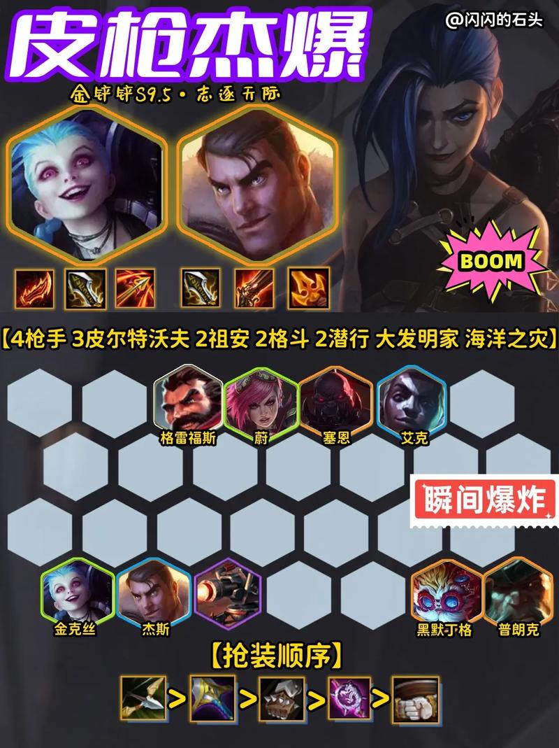 出装一 主攻金克丝,复活甲是必需品,确保能够成功释放大招且不会因跳入人群而自毙。输出装备选取无尽和法爆,以最大化技能伤害。这套装备的伤害极高,基本上只要大招一开,对面就会有大片单位被消灭。出装二 平A特效流金克丝的核心在于提升攻速,她的枪手羁绊可以触发额外伤害。