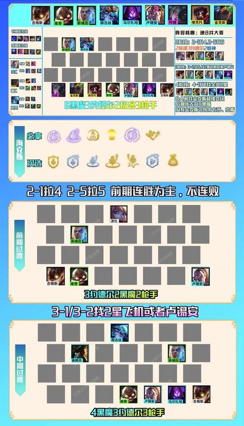 〖Four〗、运营攻略建议开局优先抢反曲弓,初期过渡组合包括弗拉基米尔、嘉文四世、伊莉丝、派克,优先肉装给皇子,输出装备给卡莉斯塔。中期寻找卡莉斯塔并开出6猩红,装备搭配根据阵容需求灵活调整。后期上8人口大搜基兰与剑魔,最终形成9猩红阵容,利用至尊魔神加里奥继续攒钱上9人口。