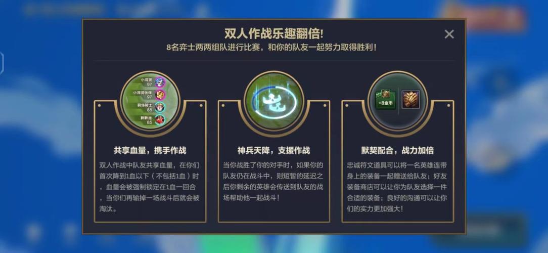 〖Three〗、金铲铲之战双人作战玩法介绍:共享血量,携手作战双人作战中队友共享血量,在你们首次降到1血以下(不包括1血)时血量会被强制锁定在1血一回合,当你们再输掉一场战斗后就会被淘汰。