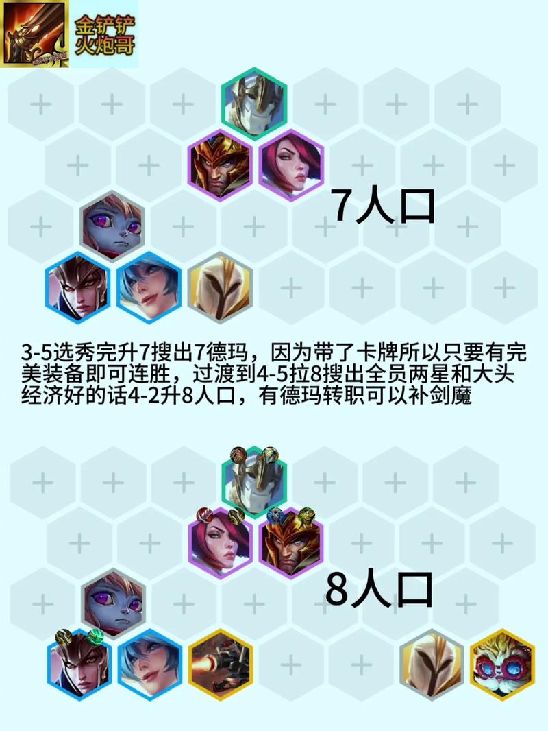 人口时,根据变异效果调整阵容,如生化汲取则上4格斗家,其他变异效果上玛尔扎哈。若有两星大虫子,连胜可期。8人口后,卖掉女警和蔚,上5变异+2巨像,追大虫子和玛尔扎哈三星。若经济允许,可升9人口,推荐维克托(用大嘴时,推荐金克丝)。