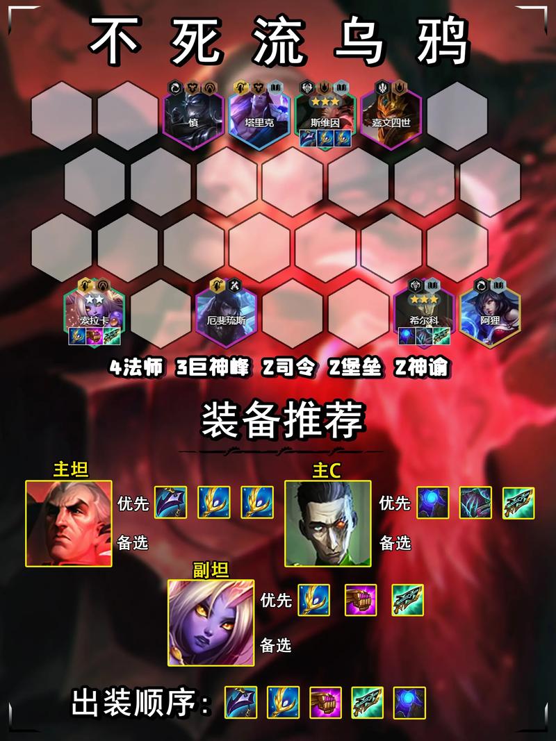乌鸦是爆发坦,3羁绊棋子,技能造成群体伤害与群体吸血,在变身结束后还能额外造成一次群伤,技能效果逆天特别是搭配4帝国羁绊的时候,伤害极高,而在6换型羁绊下能增加极高生命值,变身打不死的小强。