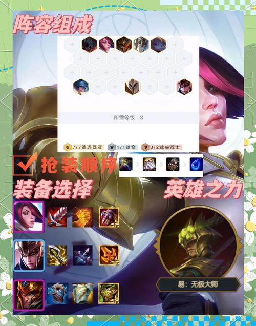 金铲铲之战挑战永恩阵容玩法攻略如下:阵容搭配:核心成员通常包括永恩、剑姬、布隆等,构成6挑战者、2战斗学院、2保镖等羁绊效果。永恩和剑姬是核心输出,布隆则提供稳定的控制。装备选取:永恩作为主C,他的必备装备是分裂弓和复活甲。