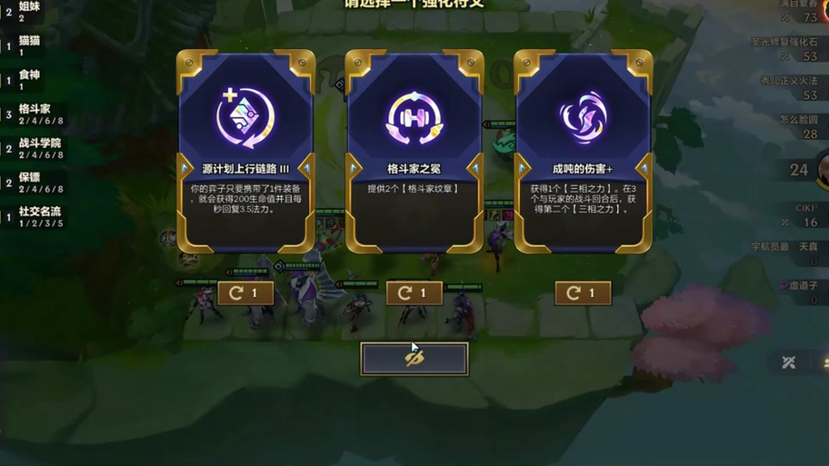 第一个海克斯,这套阵容无脑拿战力海克斯即可。4人口,朋克就是直接拿对应的过度即可,前面可以搭配射手一起过度。后续不断补秘术护卫即可。2-4选秀,选秀找前排盖伦装备先。中期运营 第二个海克斯,依旧还是无脑拿战力海克斯即可。