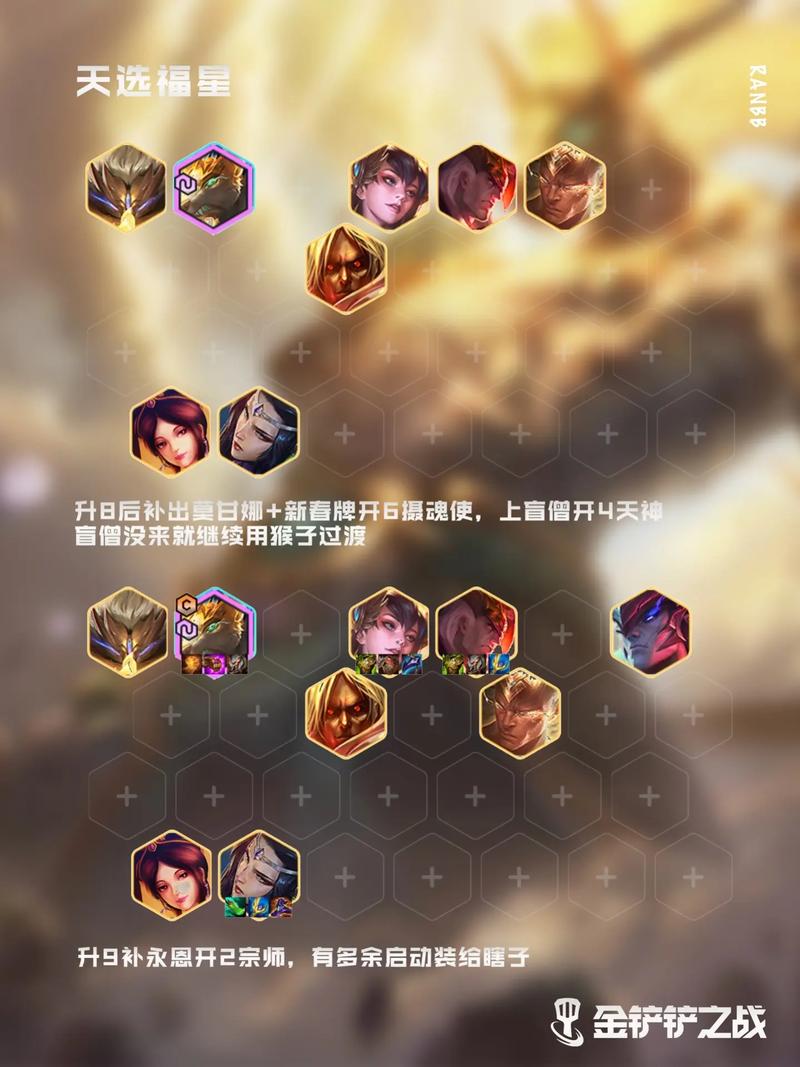 〖Four〗、在9人口时,补充新春使者卡片,开启6摄魂使者,替换低费的天神卡牌。有天神转职的情况下,可以继续开启6天神。如果没有,可以选取补充永恩多开宗师,或上场任意二星五费卡片。下面,慢慢追求二星五费卡,或者三星莫甘娜。