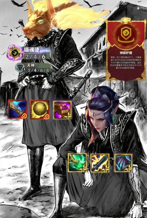 天命护符:你的【天选之人】弈子在生命值掉落至50%与20%时,会获得持续2秒的伤害免疫效果。1神御护盾:提供一名【弗拉基米尔】。【摄魂使】弈子们在战斗开始时获得相当于20%最大生命值的护盾值。溢出的治疗量比较多可形转化为相当于100%最大生命值的护盾值。