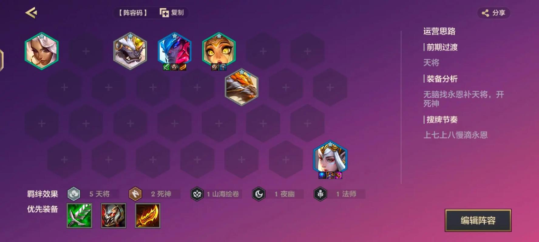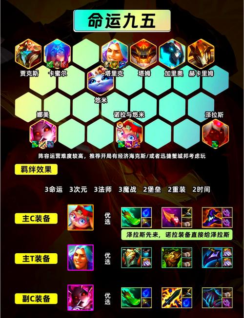 在装备推荐上,主C英雄焰魂可以选取青龙刀、大天使和科技刀,以提升技能释放效率和法术强度,同时保证续航。虚空恐惧作为主坦,应优先装备肉装以增强生存能力。雷霆之主作为副C,装备应兼顾肉装和防御,以承担阵营内的抗伤害角色。