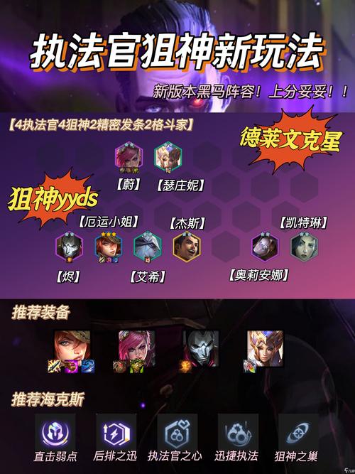 在金铲铲之战皮城执法官阵容中,推荐的核心英雄包括:杰斯、蔚、猪妹、烬、发条、女枪、艾希和女警。构建4个执法官、4个狙神和2个精密发条的阵容。如果拥有转职或增加狙神数量的海克斯,也可以考虑凑成9人口并组建6个狙神。