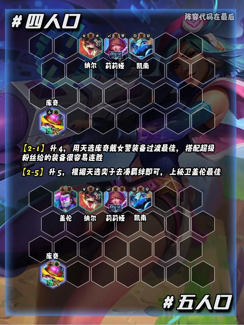 〖Two〗、阵容站位:俄洛伊的触手放在第一排,其余前排站在第二排。卢锡安与女警站在同侧以提供破甲效果,女警不要站在角落以防刺客。搜牌节奏:4-2或4-5升八人口,大搜一波找出四/六8比特和女警的天选。如果没有俄洛伊,可以用瑟提代替;没有卢锡安,可以用巴德代替。