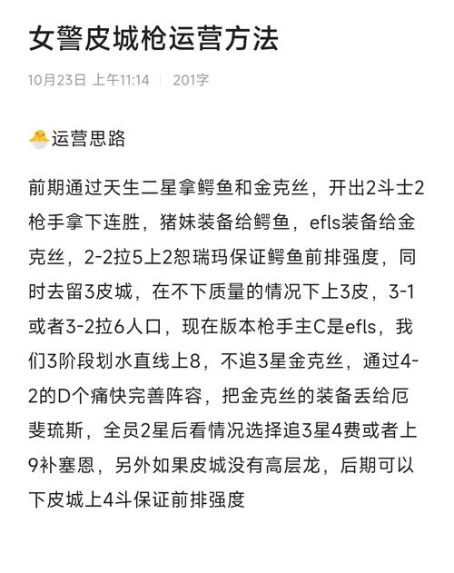 〖Two〗、金铲铲之战s10女警主C阵容玩法如下:阵容组成 成员:盖伦、莫德凯撒、艾克、布里茨、锐雯、卢锡安、库奇、厄斐琉斯、凯特琳(女警)。解析:该阵容灵活性强,玩法多样,能够应对多种战斗环境。符文推荐 银色符文:潘多拉的装备、白银面纱、不拘一格、酷热打击等。