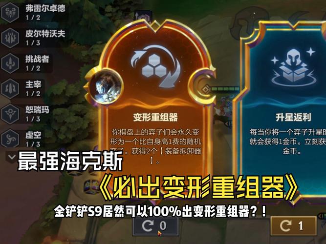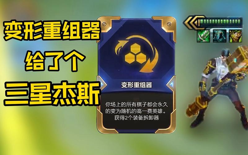 〖Two〗、金铲铲之战确实存在一种名为变形重组器的特殊装备。这款金色海克斯在游戏的第4至第6阶段有机会随机出现。当你使用变形重组器时,你场上所有单位将永久性地转换为比原本费用高出1费的随机单位,并且每个单位还会额外获得两个装备拆卸器。