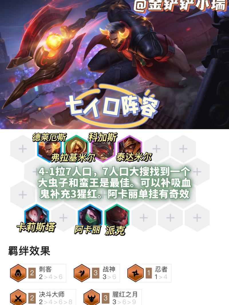 阵容组成:永恩、刀妹、武器、盲僧、肾、猫、霞、千珏、天使。阵容强度:成型必吃分,质量够高能吃鸡。核心装备:羊刀、火炮、旗子(千珏/霞)运营思路:①弓开局的话尽量走连胜,装备不需要抢的情况下。②开局可以三国豹女带装备,也可以看天选走。
