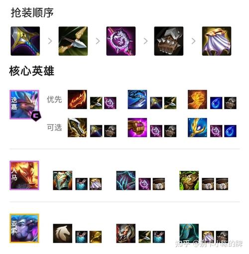 〖Two〗、关键角色装备如下:迭嘉需巨杀(大剑+攻速)、羊刀(法棒+攻速);亚索需泰坦(板甲+攻速)、水银(拳套+斗篷);人马需鬼书(腰带+法棒)、石像鬼(板甲+斗篷)。主C迭嘉必备巨人捕手和鬼索的狂暴之刃,第三件可选续航类装备如正义之手、海克斯科技枪刃;副C亚索必备泰坦的坚决和水银。
