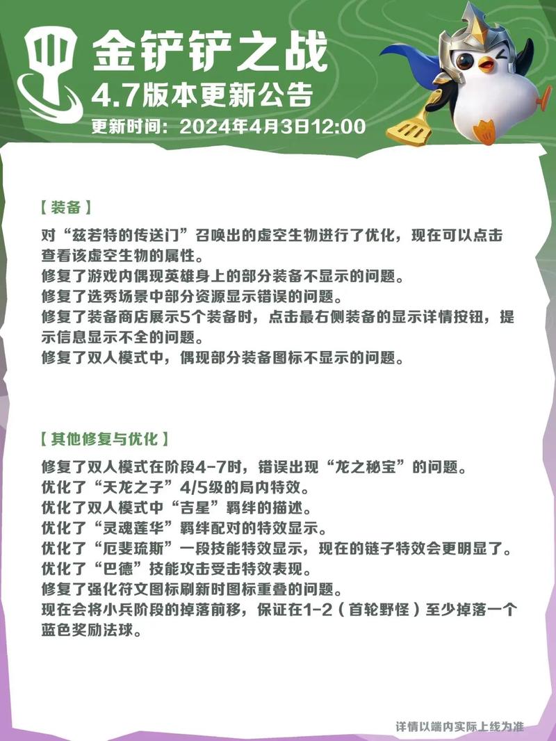 〖Four〗、金铲铲之战这款游戏在2021年12月9日进行了重要更新,更新时间为当天的上午9点。这次更新的主要内容是对羁绊相关的【海克斯强化】进行了重制和增强。此外,还调整了部分【海克斯强化】的平衡性和出场率,以优化游戏体验。