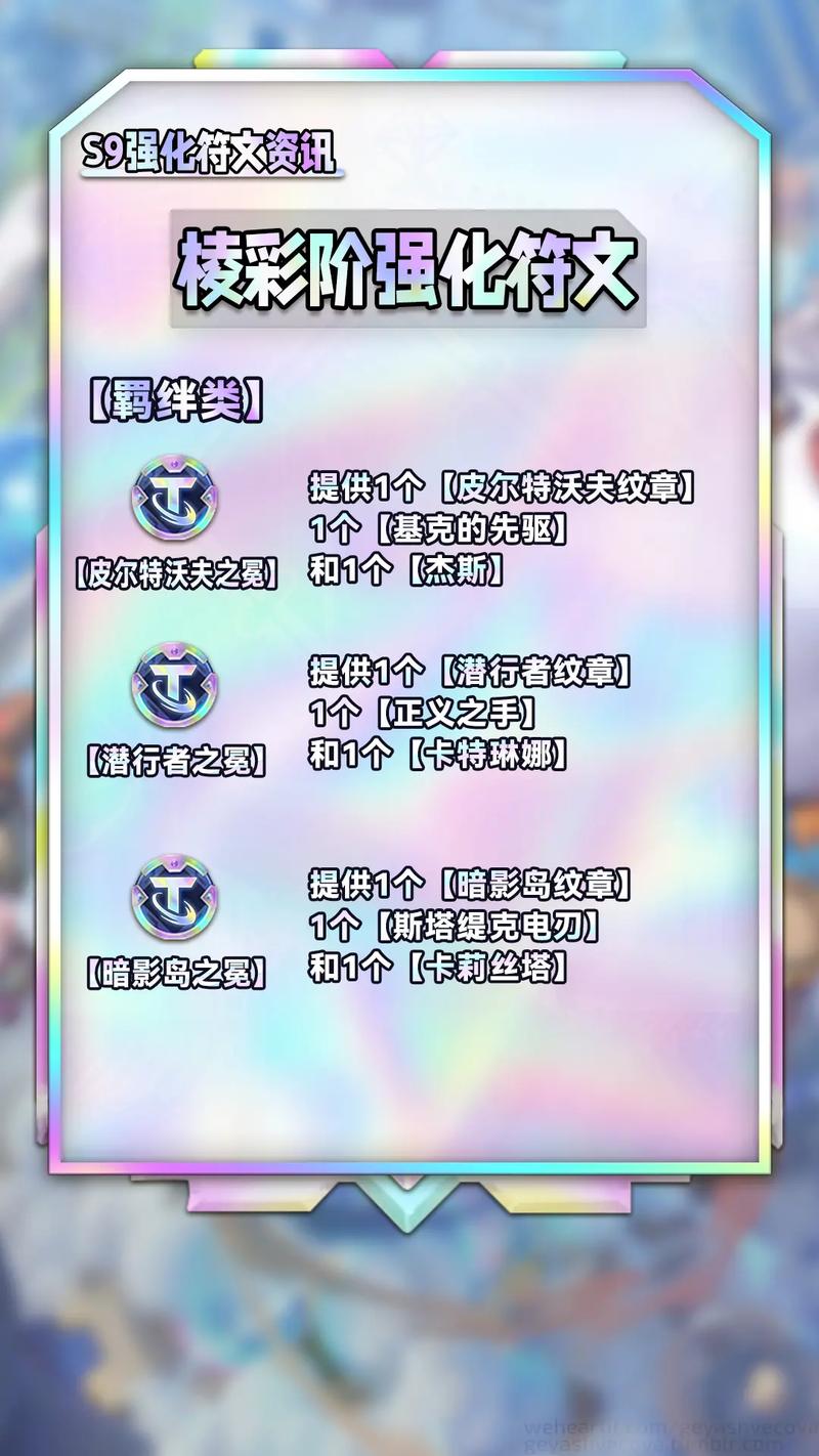 金铲之战s9海克斯图画大全 棱彩阶强化符文 功能类 多多益善 你的团队规模增加了一半。你的游戏玩家只能携带一件装备来提供两枚金币。多多益善 您的队伍规模提升为您的一半,您的棋子只能携带1件装备提供12枚金币。