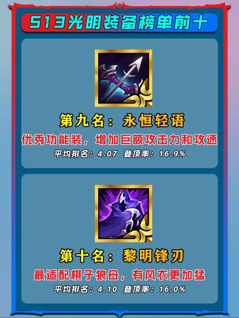 当没有更好的选取,或是需要有吸血时,也可以选取。适合阵容:大嘴、发条、没带吸血装的萨米拉(因为萨米拉技能伤害高,所以吸血也很快)原计划植入(__)比较辣鸡的海客斯,加的血量攻击力聊胜于无。但有一个例外,如果你想前期打连胜可以选,选了后给每个棋子上一个散件,前面加的血量和攻击相对来说还是比较可观的。