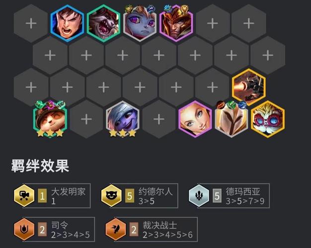 约德尔人阵容:以低费卡为基础,前期容易成型。核心英雄为小炮和阿狸,装备推荐无尽之刃、蓝霸符等。海克斯推荐“如此矮小”、“黄金门票”等。执法官狙神阵容:拥有强大的控制和输出能力。核心英雄为烬和泽丽,装备推荐无尽之刃、轻语等。海克斯推荐“执法官之心”、“狙神之巢”等。