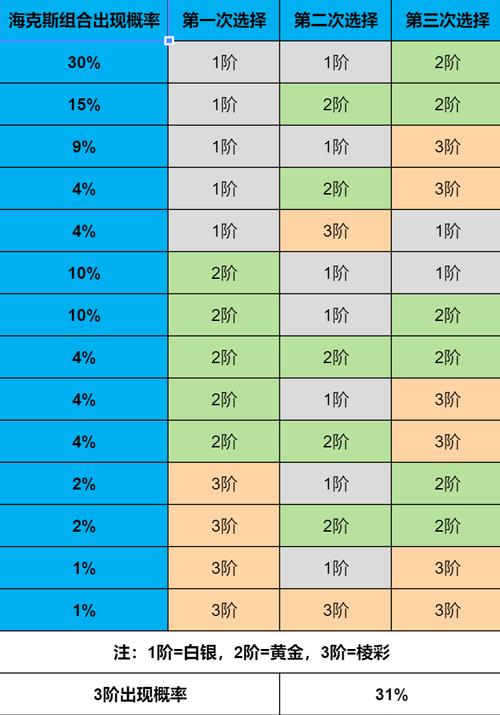 〖Two〗、在金铲铲之战游戏中,银银金的海克斯等级组合出现概率比较高,达到百分之三十。相比之下,彩彩彩的组合出现概率最低,仅有百分之一的机会。游戏中各种海克斯颜色的组合出现概率分布情况如下图所示。图中清晰地展示了不同海克斯颜色组合出现的概率。其中,银色和金色的组合最为常见,而多彩组合则较为稀有。