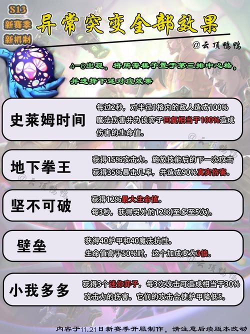 〖Three〗、金铲铲之战的异常突变包括多种效果,这些效果能够显著增强弈子的战斗能力,为玩家提供丰富的策略选取。首先,一些异常突变直接提升弈子的攻击属性。例如,迷你兵突变使弈子获得3个小型单位,这些单位每3次攻击就能造成40%的攻击力伤害,并减少目标的5点护甲。