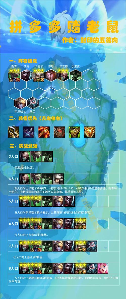 〖Four〗、金铲铲之战赌老鼠阵容攻略装备主C老鼠:羊刀、飓风、巨杀。优先做羊刀,第二件做飓风。大剑多就做杀人剑。副C呲呲:日炎必做,呲呲技能机制注定全图乱飞,带日炎可以烫到更多单位。其余装备可以做饮血泰坦半坦输出装。主坦猪妹:给肉装散件触发海克斯效果,也可以做日炎过前排。