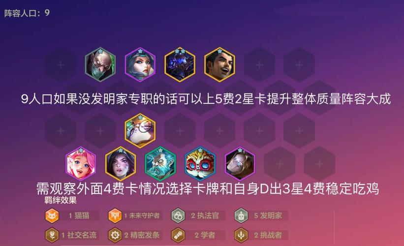 确保阵容中英雄没有激活任何羁绊。选取英雄时,避免那些单人就能激活羁绊的英雄。例如,塔姆是食神羁绊,金克斯和蔚是宿敌羁绊。使用卓尔不群海克斯时,优先选取能增强全体英雄个体的海克斯。比如浪人、蓝电池等。运营时,正常过度升人口即可。避免上单人就能激活羁绊的英雄。
