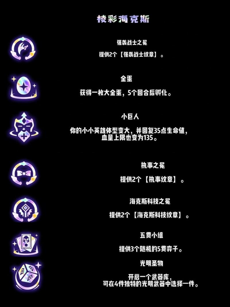 〖Four〗、金铲铲之战霓虹之夜赛季全海克斯效果介绍新赛季霓虹之夜版本将在2月17日上限国服,新赛季之前的许多海克斯强化将会离开,如战斗学院之心、帝国之心、双人统治、圣盾使之心、战斗学院荣誉、考前恶补、帝国之徽、人人为我、壁垒、战斗学院之冕、帝国之冕、圣盾使之冕等。