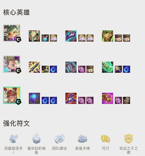 卡萨丁的装备推荐为飓风+飓风+肃静/降星之刃,飓风激活被动技能,扣除敌方法力值,肃静或降星之刃则可阻止对方英雄释放技能。皮城执法官的装备应以法术强度为主,如珠光护手、海克斯科技枪刃、巨人捕手等。青丘狐狸作为辅助角色,所有辅助装备都应给予,避免给其装备造成伤害。