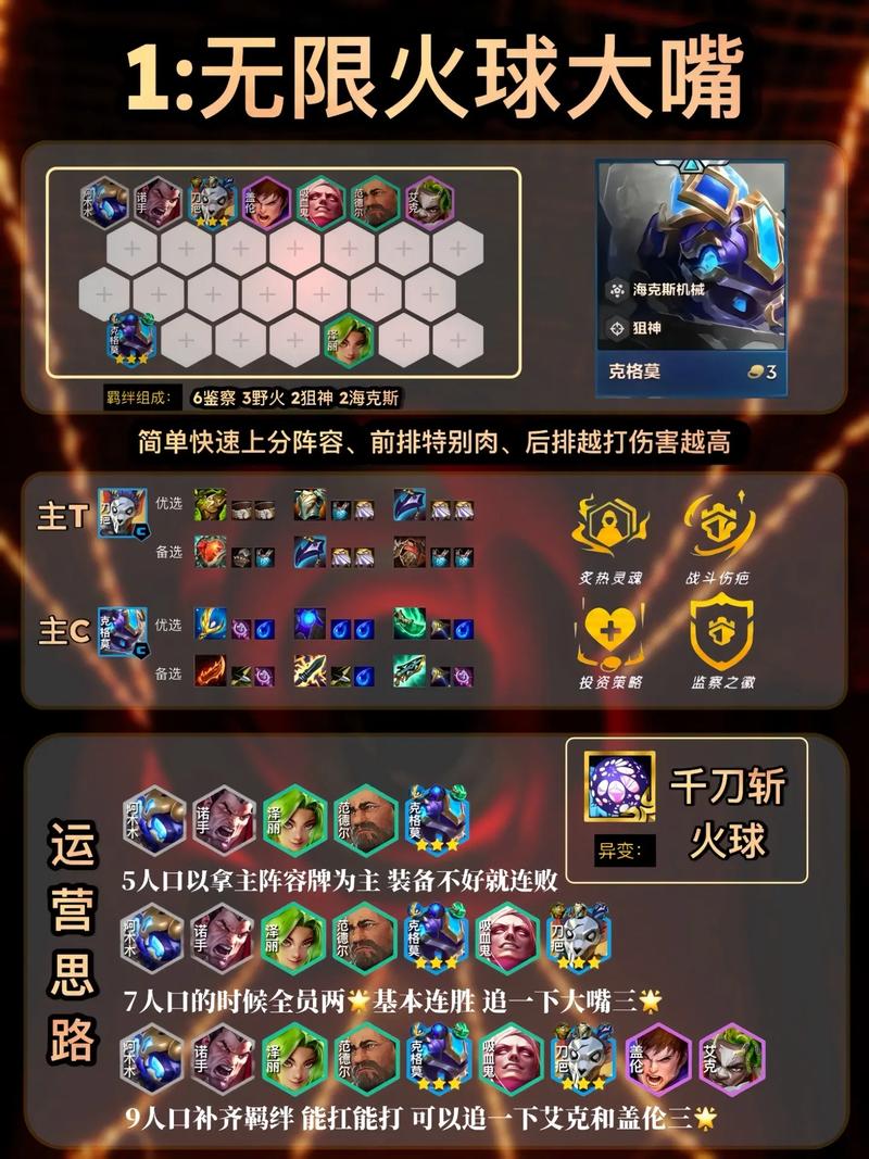 九人口阵容后期变阵4-5/5-1拉八,大搜找阵容中大部分卡的二星和至少一张卡莎开7变异,源计划非常吃7变异,5变异加成的属性太低强度不足。选秀有变异转也可以拿,变异转的外援选角看来牌情况调整,塔姆、蔚、德莱文都可以先拿来过渡,稳定质量后迅速上九找五费卡。