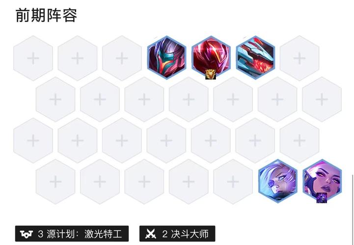 〖Two〗、运营玩法: 开局抢金铲铲,优先合成变异战士纹章。海克斯选取优先变异战士之徽/冕提供卡萨丁,提供变异战士纹章。开局1-4或3-3拿到变异战士之徽,阵容天胡,无需自己抢铲子合成变异转职。前期过渡:六人口阵容,开局变异是突触网络时,建议玩这套阵容。
