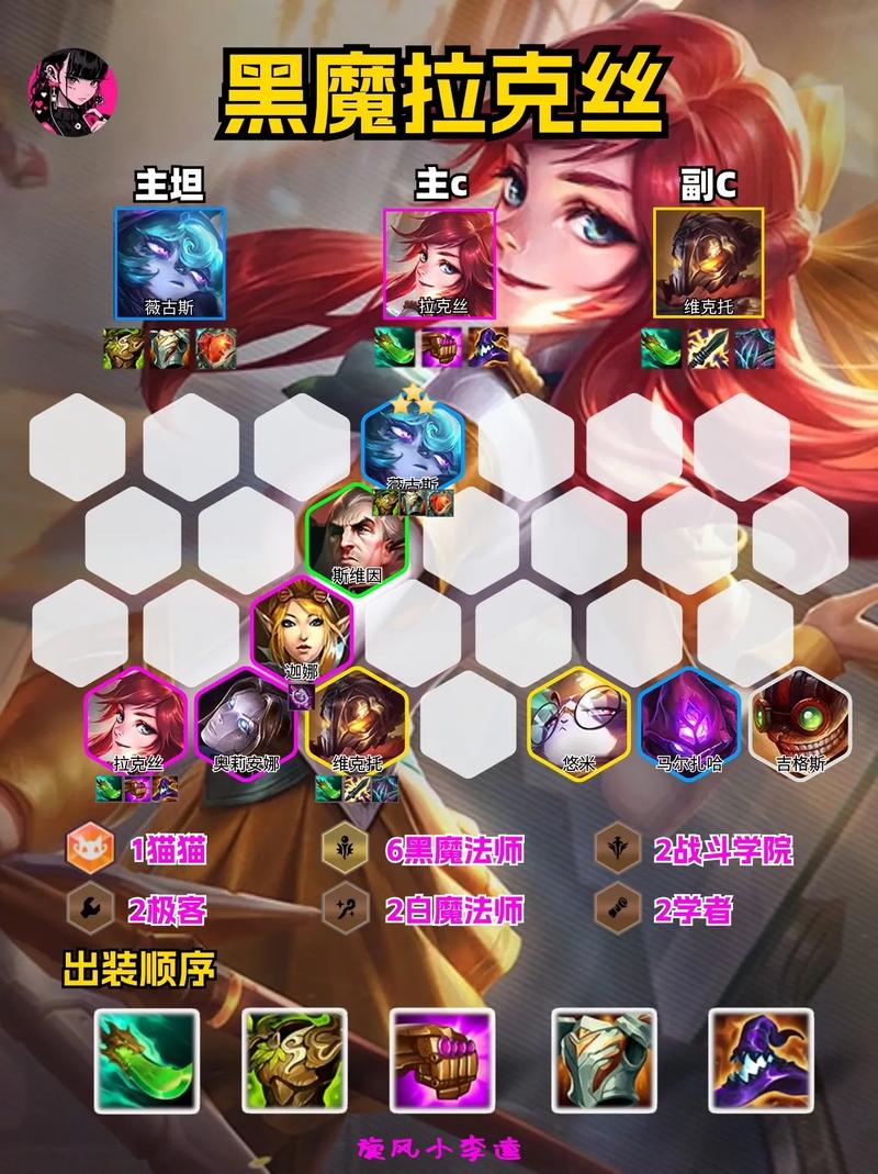 〖Four〗、在具体搭配上,璐璐、斯维因、马尔扎哈、薇古丝、塔里克、迦娜、拉克丝和维克托(如有黑魔法师转职)是阵容的组成单位。其中,6个黑魔法使和4个白魔法使的羁绊,为阵容提供了强大的魔法伤害和控制能力。