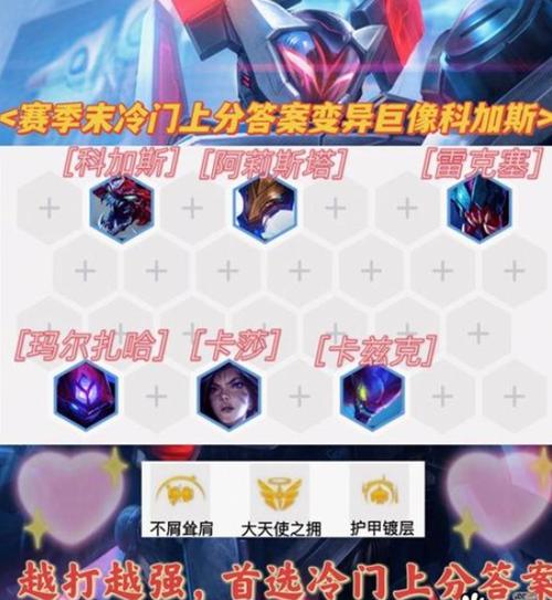 科加斯:救赎(女神之泪+巨人腰带)、狂徒铠甲(巨人腰带+巨人腰带)、日炎斗篷(巨人腰带+锁子甲),备选:石像鬼石板甲、龙爪。科加斯是【巨像】中的英雄,搭配一些合适的海克斯强化之后特别强。如【护甲镀层】,可以让其在生命值降到60%、30%时,获得2秒的免疫效果。