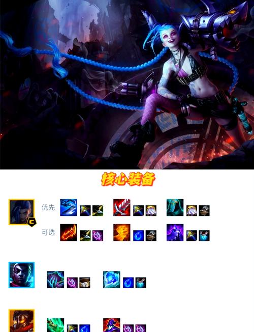艾克:冰心+鬼书,散件如冰心+大棒/腰带或鬼书+锁子甲/水滴。炸弹人:水滴、魔抗、腰带。刀妹:偷偷或拳套、腰带、魔抗、锁子甲、宝剑。杰斯:轻语可极大增加金克丝输出效率。维克托:后期捡垃圾,如果阵容法强装备多前中期可给予炸弹人后期转给维克托。