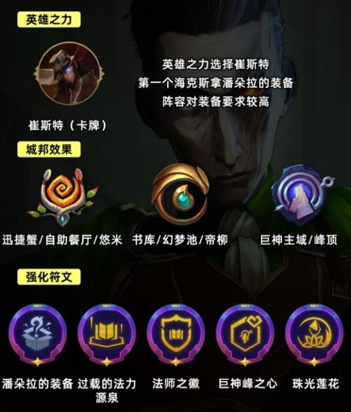 阵容推荐:沙皇,狗头,拉克丝,皇子,盖伦,斯维因,提莫,岩雀,他们共同构建了一个4司令3恕瑞玛3德玛的羁绊。选取这些角色可以最大化你的战斗实力。 强化符文选取:首先考虑使用潘多拉的装备,鲜血转换,部分飞升。其次,战斗准备2和源计划巨块2也是不错的选取。