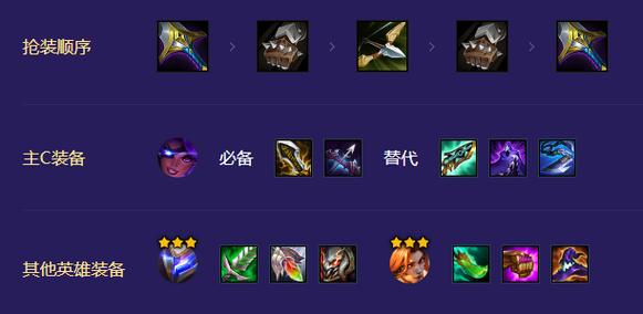 加里奥装备推荐:日炎斗篷、救赎、龙爪。盖伦装备推荐:狂徒、龙爪、棘刺背心。贾克斯装备推荐:女妖之爪。【搜牌节奏】3-2阶段,拉6人口,确保阵容强度,打工牌可适当小搜。4-1阶段,拉7人口,继续小搜,抢基础牌,打工牌更换为2星三费或1星4费,然后开始存钱。