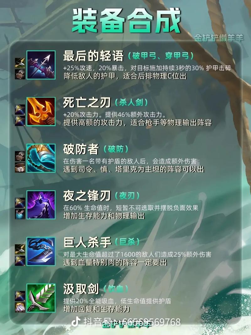 〖Five〗、首先,必备装备包括海克斯科技枪刃和无尽之刃。这两件装备能显著提高泰隆的攻击力和暴击几率,使其在战斗中更具威胁。