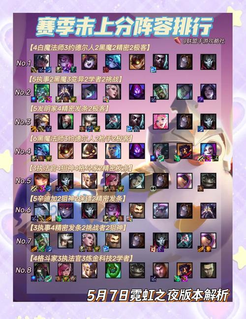 〖Five〗、霓虹之夜版本前十上分阵容推荐 vip执事火男 卢登、魅力、存心、执事转属于天胡有眼泪必玩,其他分段不高的时候有眼泪可以强行玩。白魔赛娜 香炉修复为前期高战力天胡,其他的看着增加即可,应急护甲这种防御向的最佳。