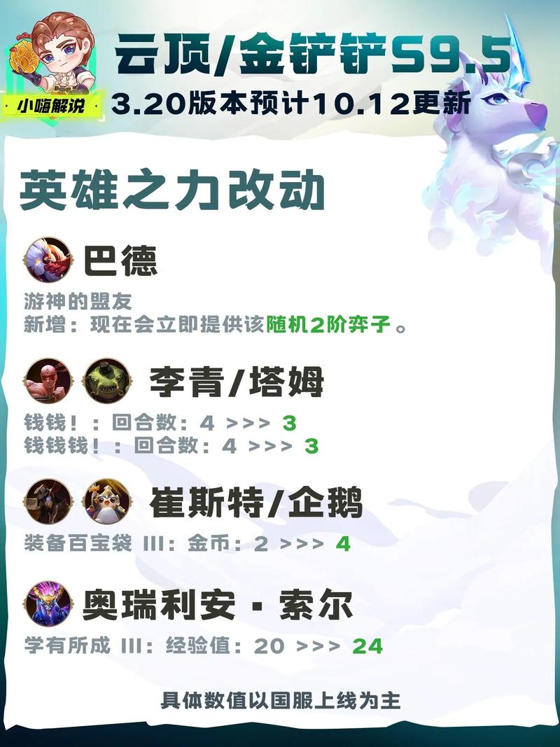 〖Six〗、金铲铲之战S13赛季的更新带来了许多新内容和改动。例如,新英雄安蓓萨的登场,她作为新英雄,费用大概率会是4费或5费,为游戏增加了新的策略性和可玩性。