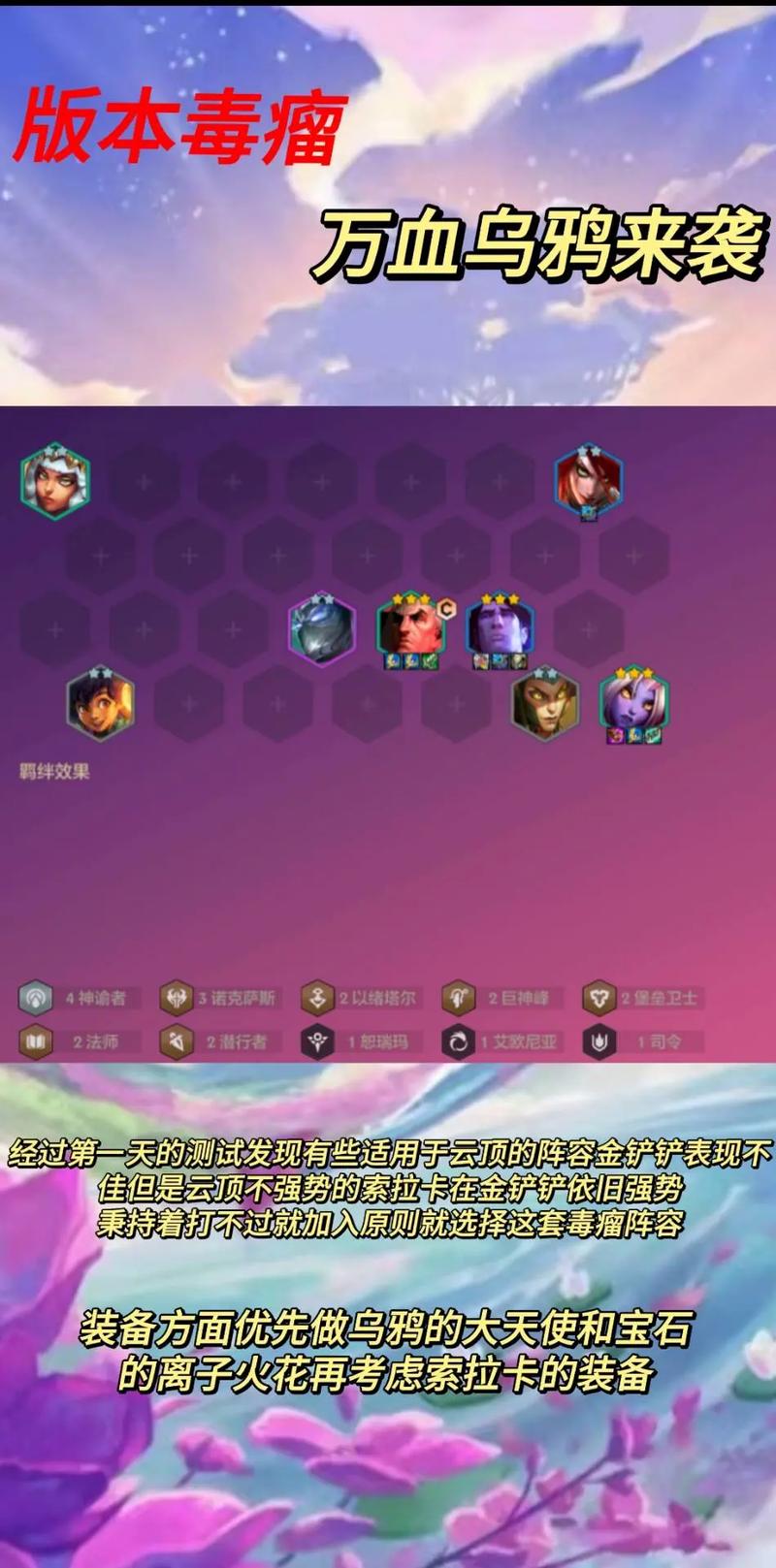 〖Two〗、金铲铲之战帝国乌鸦阵容神装:无尽法爆蓝buff公式是:法爆_暴击伤害装(正义,双法爆)_一个蓝量装(蓝buff,正义,大天使)乌鸦是走爆杀流的,装备对,开局就是前排后排一个技能直接抓死,根本不需要什么拖大天使。