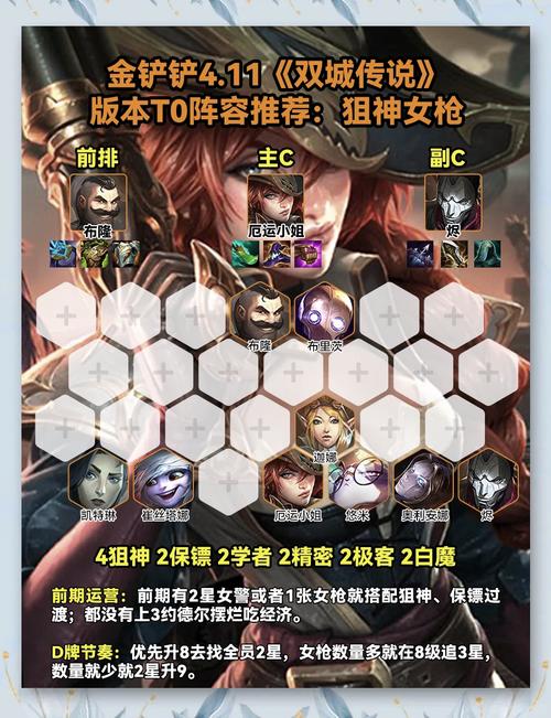 〖Two〗、在金铲铲之战皮城执法官阵容中,推荐的核心英雄包括:杰斯、蔚、猪妹、烬、发条、女枪、艾希和女警。构建4个执法官、4个狙神和2个精密发条的阵容。如果拥有转职或增加狙神数量的海克斯,也可以考虑凑成9人口并组建6个狙神。
