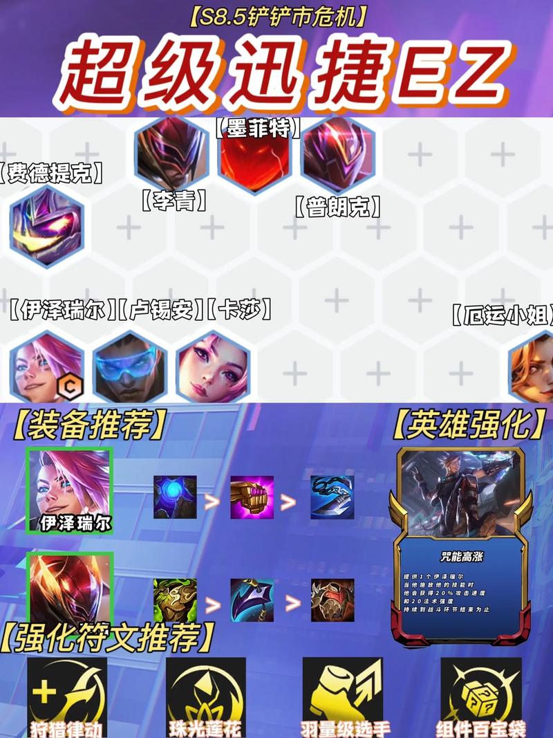 〖Two〗、伊泽瑞尔:蓝buff、法爆、巨杀或无尽。蓝buff提供技能释放频率,法爆增加技能暴击伤害,巨杀或无尽提升单体输出能力。墨菲特/李青:肉装如反甲、龙牙、狂徒等,提升前排坦度。厄运小姐:轻语、巨杀、正义等输出装,提升清屏能力。站位推荐 伊泽瑞尔放在后排安全位置,确保输出环境。