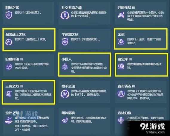 海克斯强化一览 1,首先就是蓝电池(白银、棱彩):你的弈子在施放技能后恢复一定法力值;2,妙手空空(黄金):出现在备战席的约德尔人有时会自带一件基础装备;3,小巨人(黄金):你的小小英雄体型变大,并恢复 35 点生命值。