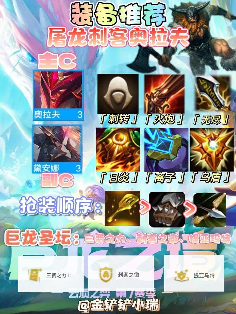 装备推荐:主C 狂战士 — 奥拉夫:刺客纹章:金铲铲+拳套无尽:暴风+拳套疾射:反曲+反曲刺转是这套阵容的核心装备,有刺转的奥拉夫可以直接开场秒杀后排。