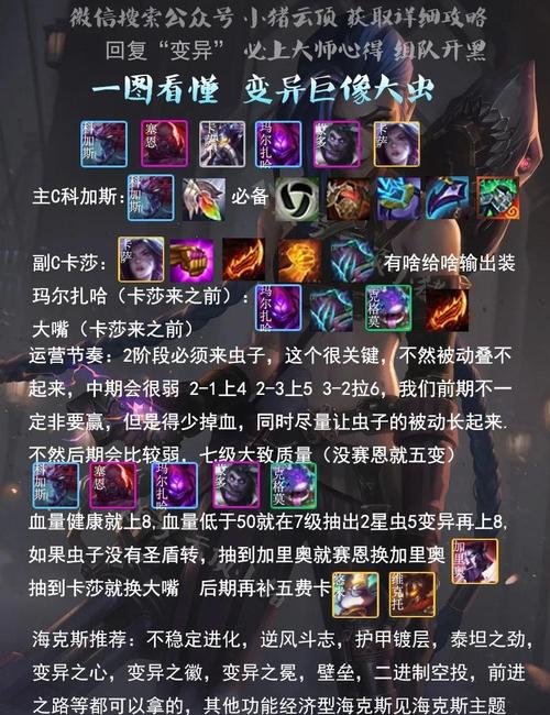 〖One〗、装备选取:大虫子完美三神装:分裂+饮血+反甲。其中反甲可用泰坦,无尽替代,饮血可用救赎or绿甲替代,不过肾上腺虫子饮血收益还是要大于救赎的。加里奥首先变异转来一个,加入7变异鬼畜阵容,核心装备是泰坦,凭借快速平A叠满无解,最后一件从无尽/分裂/正义中选取即可。卡莎核心装备大天使+鬼书。