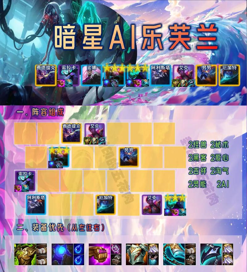 〖Four〗、选取合适的羁绊组合:璐璐的推荐羁绊包括超级英雄、爱心使者等,这些羁绊能够提升璐璐的法术输出和生存能力。特别是爱心使者羁绊,可以为全队提供增伤效果,进一步增强璐璐的输出。装备挑选:给璐璐装备上合适的装备可以显著提升她的战斗力。