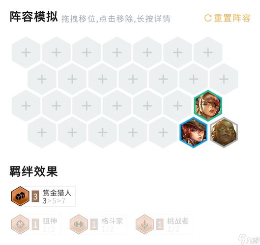 〖Three〗、《金铲铲之战》赏金猎人阵容是希维尔、艾瑞莉娅/卡萨丁、蔚/马尔扎哈、雷克赛、瑟庄妮、嘉文四世、塔姆、希尔科。前期用赏金过渡,雷克赛是最佳的羁绊选取,无论是正常过渡的变异战士还是赏金格斗都能够让其阵容拥有时刻连胜的能力。