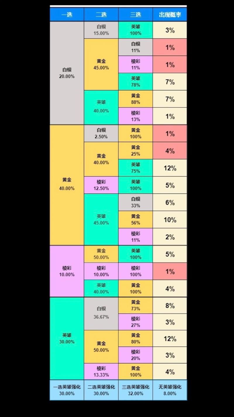 概率有1%,4%,10%,30%。近来已知的海克斯强化效果有150左右,等级分为银、金、彩色,55银、53金、41彩(自己数的,可能会误差)。玩家会在1-3-5和4-6的时候获得1次海克斯强化,每个人的都不一样,从3个海克斯里面选一个。