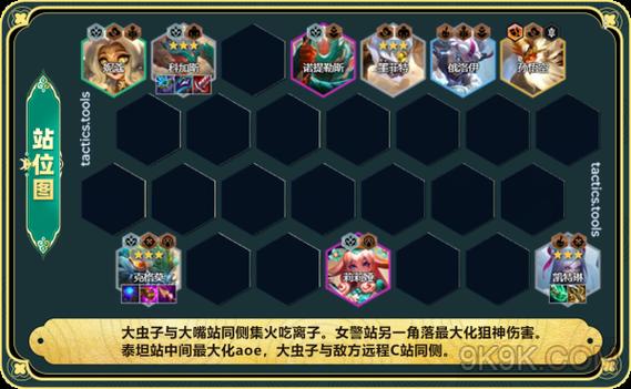 阵容分析组成阵容包括俄洛伊、雷克赛、瑟庄妮、扎克、蔚、烈娜塔、塔姆、维克托、希尔科。4格斗3炼金2学者2执法,若拥有格斗转职,则在八人口即可完成成型。若塔姆和希尔科未能获取,则可选取4格斗5炼金,九人口如有格斗转职,可上至4执法。